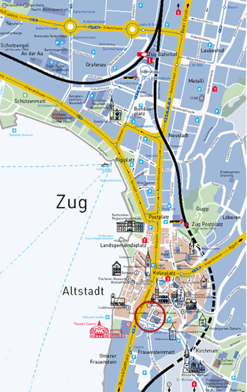 Autobahnausfahrt Zug, bzw. Zug/Baar. Richtung Arth/Gotthard fahren. Parkplätze im Parkhaus Casino.